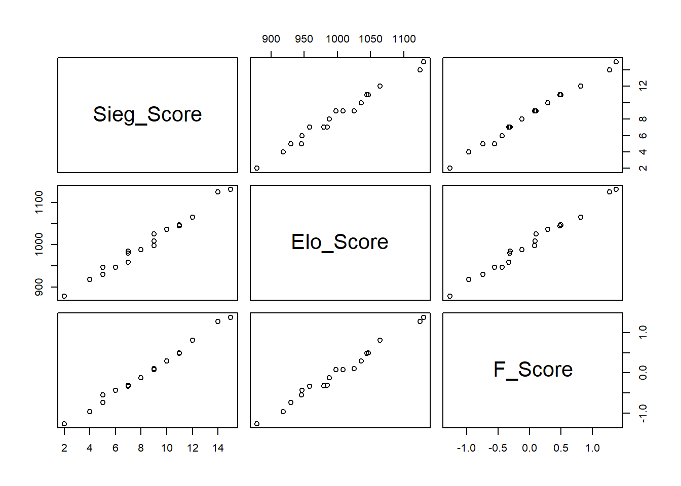 \(Elo\)-Score und \(F\)-Score sind etwas differenzierter in ihrer Abstufung. Dagegen werden Mannschaften beim Sieg-Score als gleichstark klassifiziert. Der \(Elo\)-Score hat den Nachteil, dass er mehr Informationen benötigt (die Reihenfolge der Spiele. Vereinfachend könnte diese Information aber auch unberücksichtigt bleiben.)
