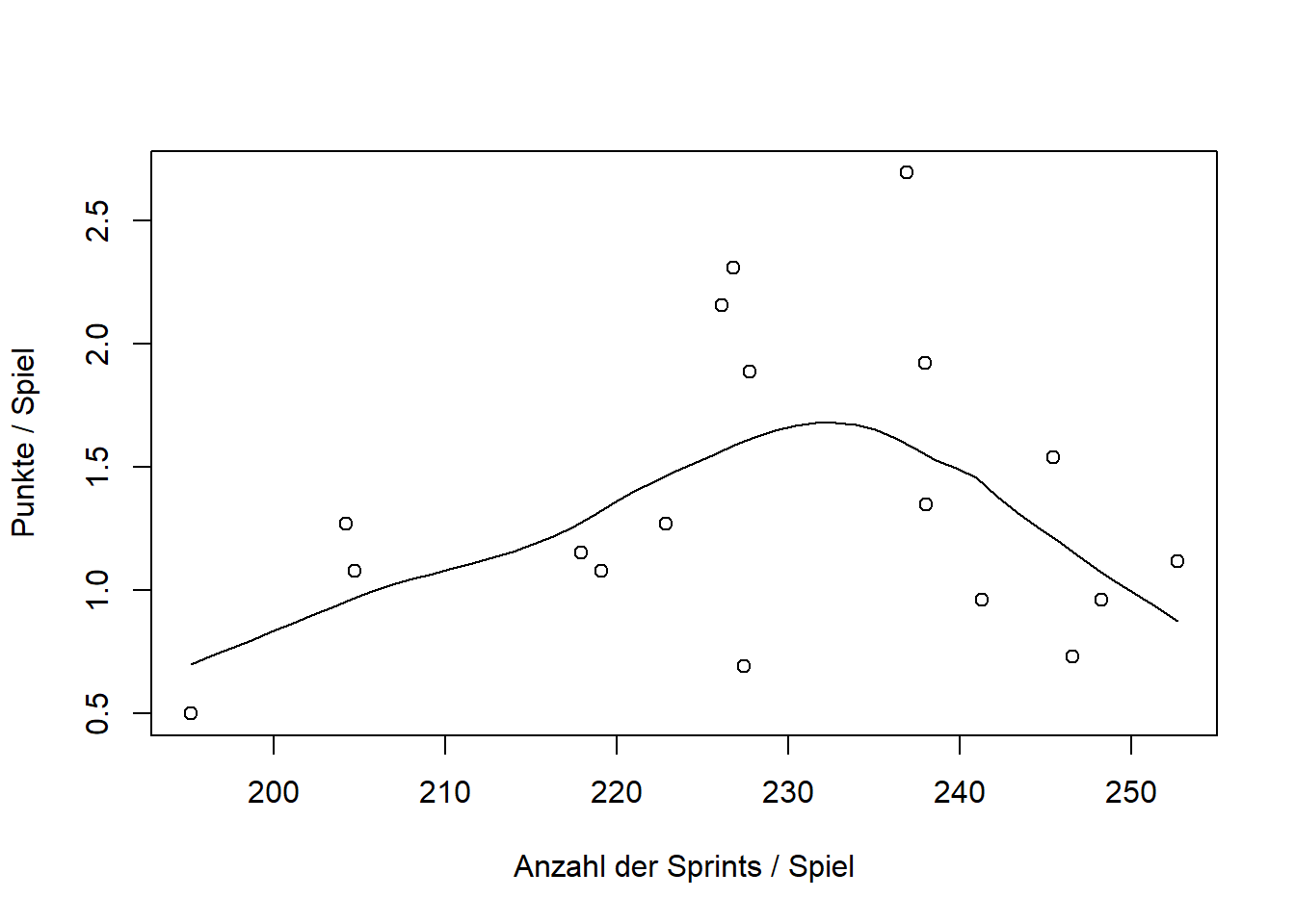 Um die Koeffizienten später besser vergleichen zu können, berechnen wir zunächst die durchschnittlichen Punkte pro Spiel und die durchschnittlichen Sprints pro Spiel. Anschließend zeichnen wir ein Streudiagramm mit einer Loess-Kurve.