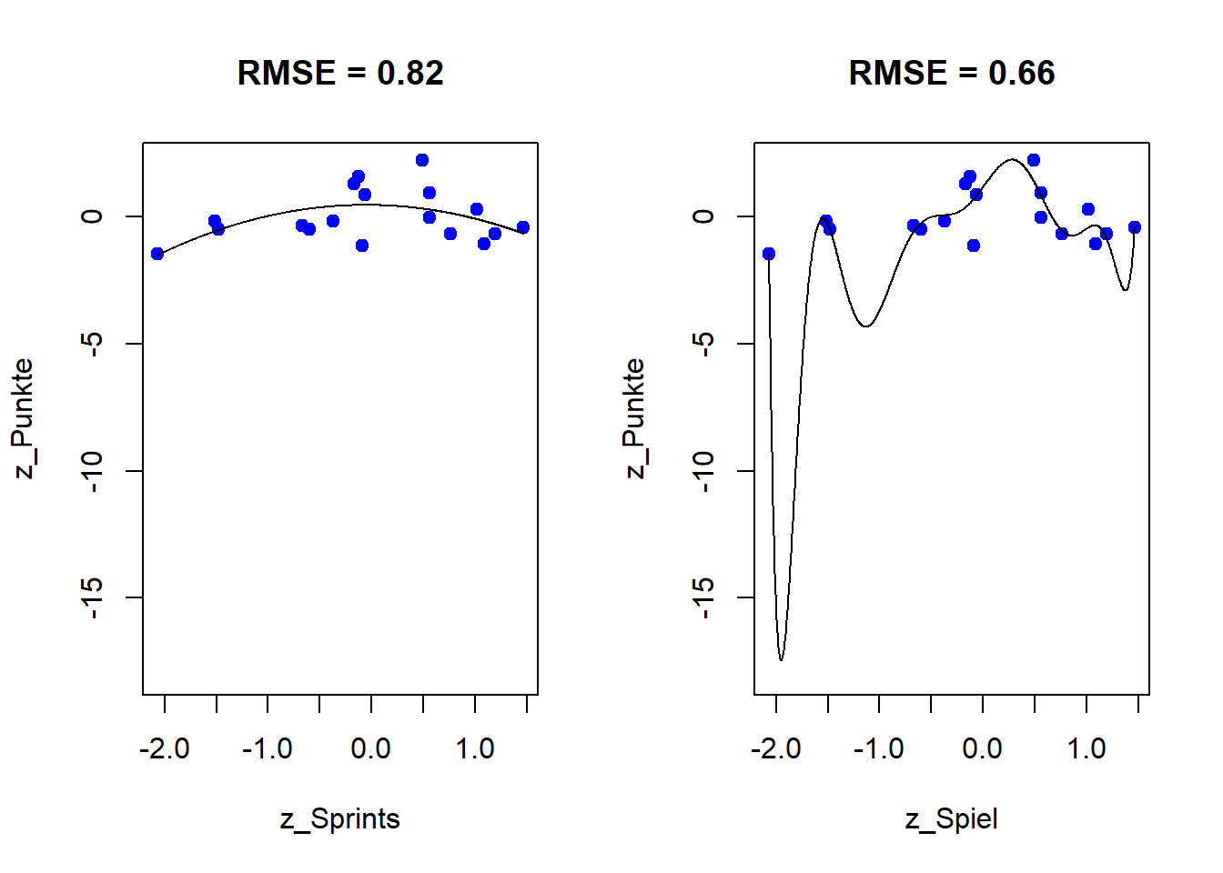 Beim Modell 10. Grades “explodieren” die Vorhersagen vollständig: Es sagt für manche Teams Werte im Bereich von über 7000 Standardabweichungen voraus. Die quadratischen Fehler sind daher gigantisch, und der RMSE landet bei etwa 1669. Das Modell ist für Vorhersagen damit faktisch unbrauchbar.
