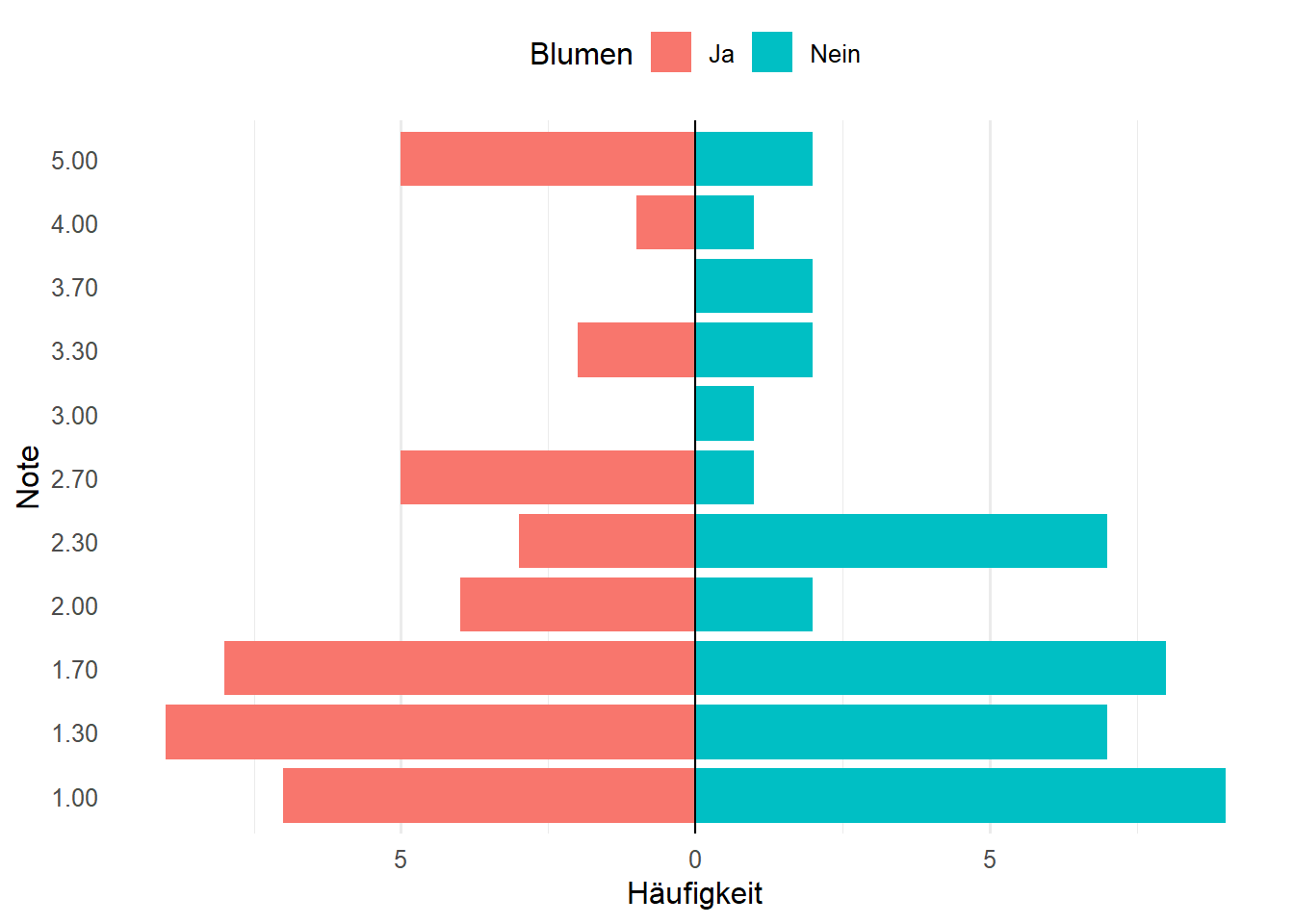 Leider hatten die Blumen nicht den erhofften Effekt tendenziell zeigen die Mittelwerte in die entgegengesetzte Richtung. Diese Tendenz ist aber sehr wahrscheinlich ein Zufallsbefund. Auch waäre es überraschend, wenn die Stressreduktion durch Blumen sich sofort und deutlich in den Noten niederschlagen würde.