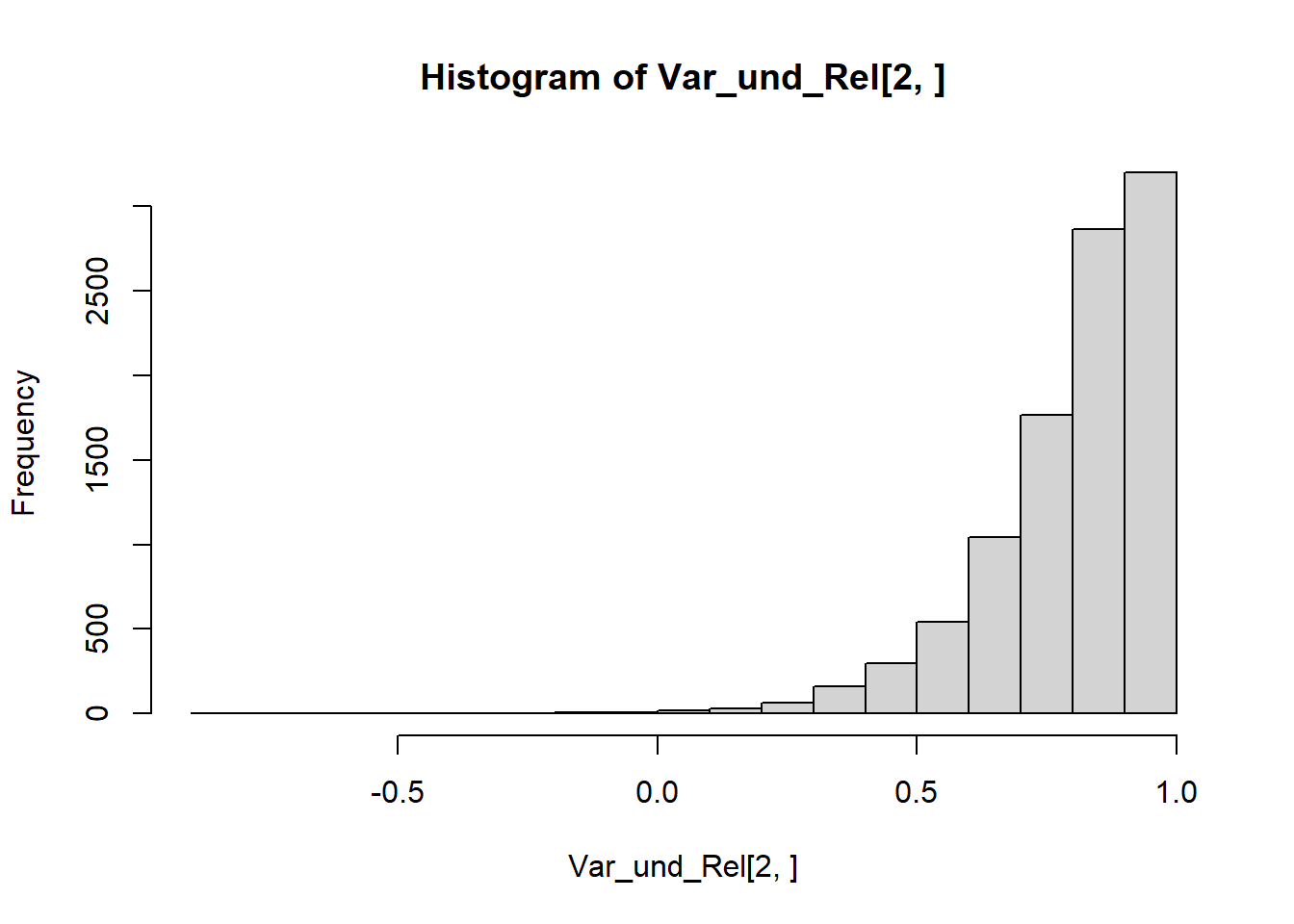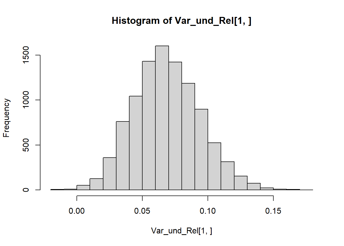 set.seed(2023)Tau <-1:5/6# Da beide Tests auf 10 Items basieren, haben wir insgesamt 20 Items.N <-10Var_und_Rel <-replicate(10000, expr = {Test1 <-NULL; Test2 <-NULLfor (i in1:length(Tau)) { Test1[[i]] <-sample(x =c(1, 0), size = N, prob =c(Tau[i], 1- Tau[i]), replace = T) Test2[[i]] <-sample(x =c(1, 0), size = N, prob =c(Tau[i], 1- Tau[i]), replace = T)}xp <-sapply(Test1, sum) / Nxq <-sapply(Test2, sum) / Nreturn(c(cov(xp, xq), cor(xp,xq)))})# Variancehist(Var_und_Rel[1 , ])