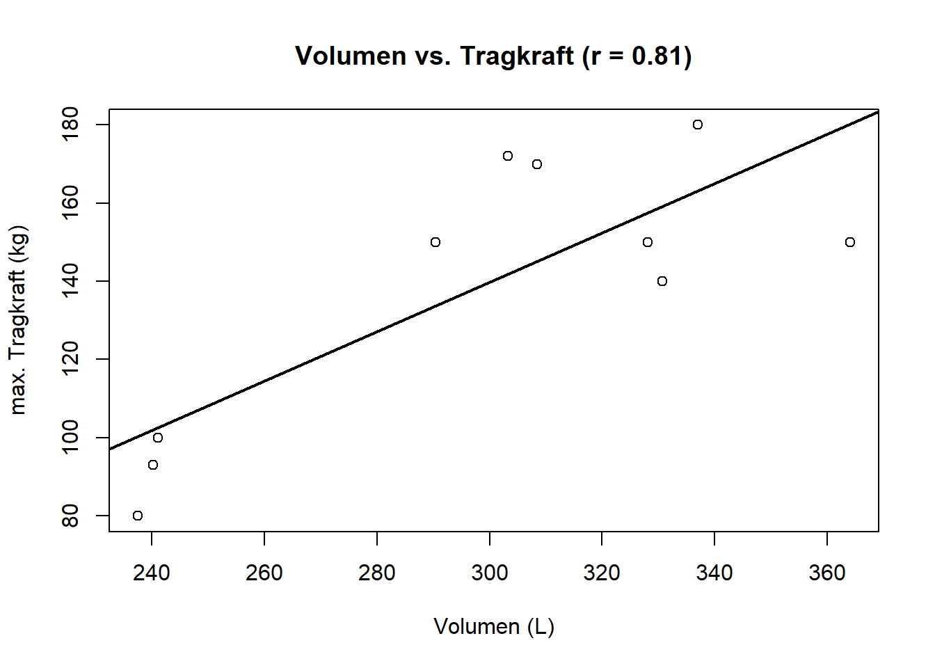 # Lineares Modell mod_lin <-lm(sups$Max_Tragkfraft ~ Vol)# Scatterplot mit Regressionsgeradeplot( Vol, sups$Max_Tragkfraft,xlab ="Volumen (L)",ylab ="max. Tragkraft (kg)",main =paste0("Volumen vs. Tragkraft (r = ",round(cor(Vol, sups$Max_Tragkfraft), 2), ")"))abline(mod_lin, lwd =2)