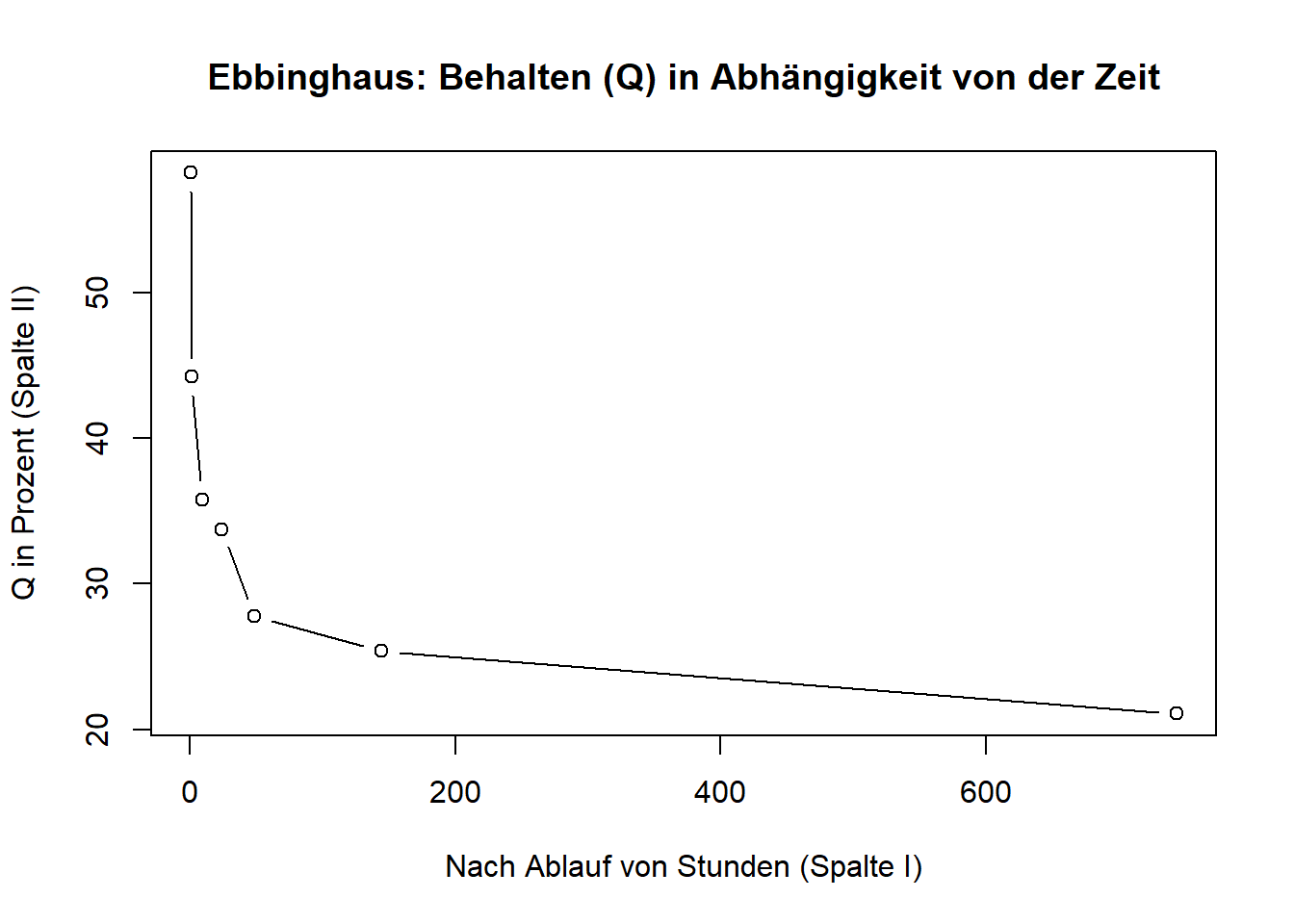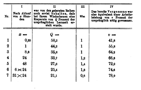 Ich möchte diesen Unterschied an einem berühmten Beispiel erklären – der Vergessenskurve von Ebbinghaus (1885) und dabei konkret auf Kapitel 7 seines berühmten Werkes „Über das Gedächtnis“ eingehen.