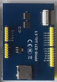 Solche 3,5-Zoll-Displays sind (September 2016) preiswert zu kaufen, haben mit 320 x 480 die doppelte Pixelzahl und bieten angenehm viel Fläche — leider ohne Touch. Die Initialisierungssequenz aus der originalen UTFT-Bibliothek eingebaut läuft diese Version prompt los, nur bei der Rotation hapert's noch.