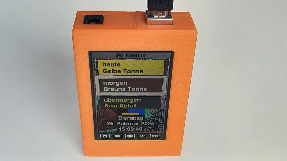 Nach einigen Diskussionen mit den Besitzern solcher Arduinos + TFT-Shields stellte sich doch noch eine sinnvolle Anwendung heraus. Natürlich nicht für Bewohner von Plattenbauten wie ich, sondern für Häuslebesitzer — ein Abfallkalender oder kurz Müllkalender. Dieser hängt in der Küche oder an der Hauseingangstür und erinnert mit einer auffälligen Hintergrundfarbe daran, die entsprechende Tonne an den Straßenrand zu stellen. Von Vorteil ist der geringe Stromverbrauch von ca. 100 mA, der sicherlich aus 80 % Hintergrundbeleuchtung besteht. Die gleiche Lösung mit einem Raspberry Pi wäre deutlich gefräßiger — und teurer.