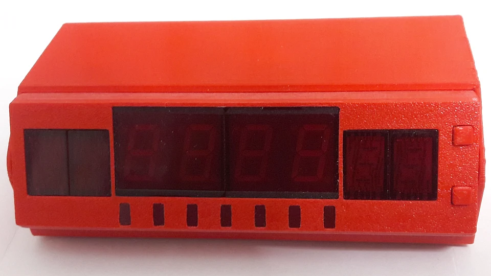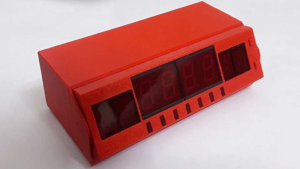 Für LED-Anzeigen nicht ganz so wichtig, eher für LCD: Nach oben schwenkbare Front bis knapp 60°. So kann man's überall hinstellen. Oder an die Decke hängen und die Anzeige per Software stürzen. Für einen 3D-Drucker eine kleine Fingerübung. Auch hier hilft Charlieplexing mit wenig Verbindungsdrähten.