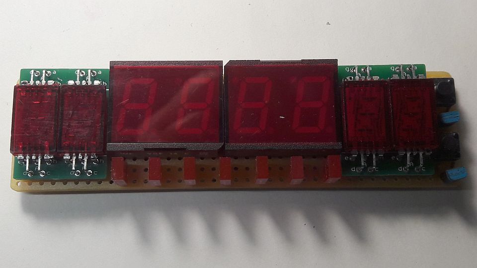 Ziel: Alte LED-Anzeigen verbasteln. Stromverbrauch egal. Funkuhr mit Sekundenanzeige und Lauflicht im Zehntelsekundentakt. Datumsanzeige. Auf Lochrasterplatine. Die Anzeigeplatine ist punktsymmetrisch bestückt und damit wendbar. Bei kopfstehendem Betrieb (bspw. Deckenmontage) müssen nur die Segmente a↔d, b↔e und c↔f getauscht sowie die Digit-Reihenfolge geändert werden.