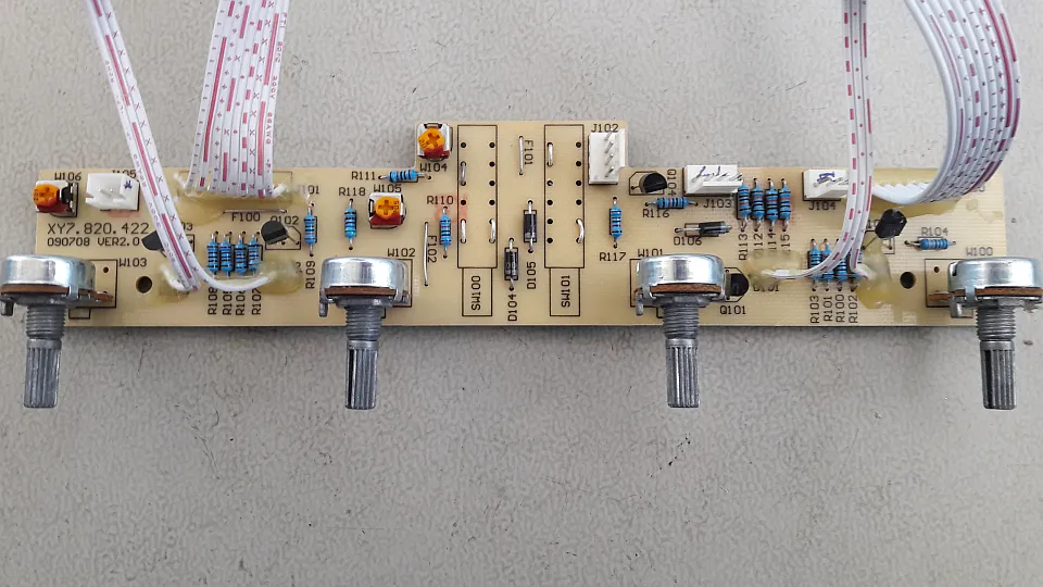 Diagnose: Im Gerät wurde bereits herumgelötet, und keiner will's gewesen sein oder etwas wissen! Werkstatt? Defekte SMD-Sicherung T4A durch Fassung für Feinsicherung gebrückt, zwei Widerstände 10 Ω an Transistorbeinen. So robust wie es gebaut ist hat man das teure Gerät mit einem kräftigen Blitz gekillt. Vor der Reparatur muss das etwaige Wirkprinzip geklärt werden, denn die vier Endstufentransistoren am Kühltunnel machen's nicht selbsterklärend. Auch die üppige Bestückung mit dem riesigen Mikrocontroller und externem RAM ist rätselhaft aufwändig, ein popeliger ATtiny2131 hätte es sicher auch getan, wenn man schon externe A/D- und D/A-Wandler bemüht und eine asynchron-serielle Schnittstelle fürs Frontpaneel will. Da viel drin ist kann auch viel kaputtgehen.