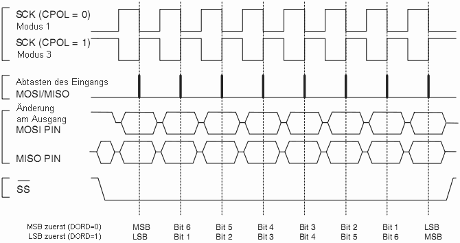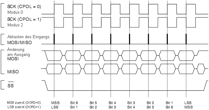 | 0 | CPOL=0, CPHA=0 | abtasten (steigend) | setzen (fallend)