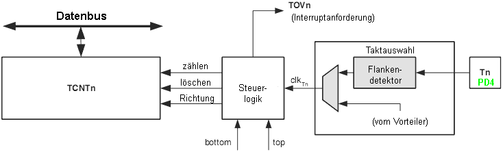 Der Zähler/Zeitgeber0 kann intern, über einen Vorteiler oder durch eine externe Taktquelle am T0-Pin getaktet werden.