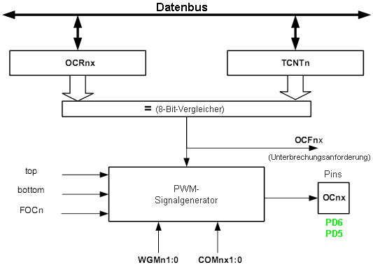 Das Zählregister TCNT0 und die Output-Compare-Register OCR0A und OCR0B sind 8 Bit breit.