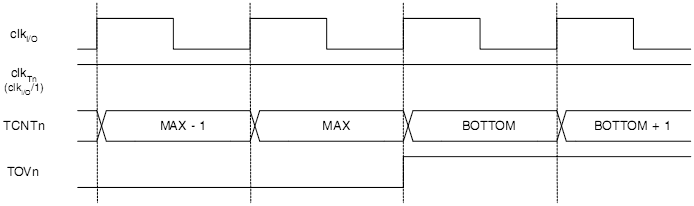 Umgekehrt gilt, dass TCNT0 nicht mit dem BOTTOM-Wert beschrieben werden sollte, wenn der Zähler rückwärts läuft.