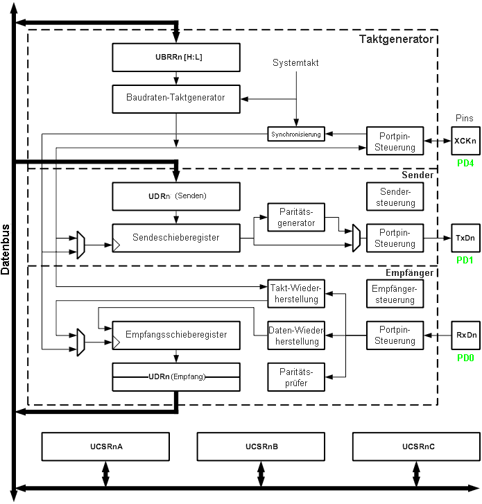 separaten Hauptbestandteile des USART: Taktgenerator, Sendeeinheit und Empfangseinheit.