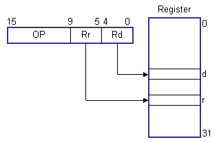 Die Operanden für den Befehl sind in den Registern d (Rd) und r (Rr) enthalten.