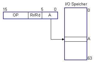 Die Adresse des I/O-Operanden ist in den 6 Bits des Befehlswortes enthalten.