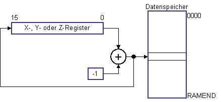 Bei dieser Art der Adressierung wird das X-, Y- oder Z-Register vor der Ausführung des Befehls dekrementiert.