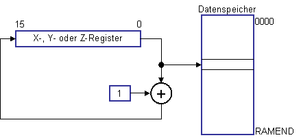 Bei dieser Art der Adressierung wird das X-, Y- oder Z-Register nach der Ausführung des Befehls inkrementiert.
