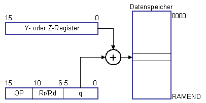 Die Adresse des Operanden ergibt sich aus der Addition des Y- oder Z-Registers mit den 6 Bits (Versatz) in dem Befehlswort.