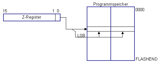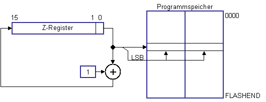 Beim LPM-Befehl selektiert das LSB das Low-Byte (LSB=0) oder High-Byte (LSB=1).