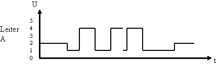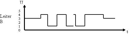 Die Spannungsdifferenz zwischen High- und Low-Pegel, gemessen zwischen B und A, sollte zwischen 4 V und 7 V liegen. Dabei sollte der positive und negative Spannungswert etwa gleich gross sein. Der Unterschied zwischen den beiden Werten liegt in der Praxis bei etwa 0,5 V. Der Ruhepegel sollte ca. 1 V betragen.
