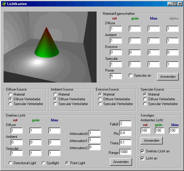 Ich habe das Programm auf den Namen Lichtkasten getauft. Alle Material- und Lichtparameter (bis auf Position und Direction) sind veränderbar. Darüberhinaus können Sie auch noch einige relevanten Renderstates konfigurieren. Nehmen Sie sich Zeit für das Programm und verändern Sie die Vorgaben nach Lust und Laune. Sie werden feststellen, dass nicht jede Lichtart mit jeder Konfiguration realistisch aussieht.