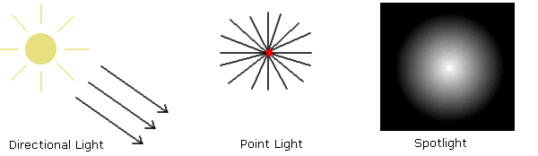 DirectXGraphics verwendet 3 Arten von Lichtquellen, die als direktes Licht auf das Objekt wirken können. Hier eine Grafik mit den englischen Bezeichnungen dafür: