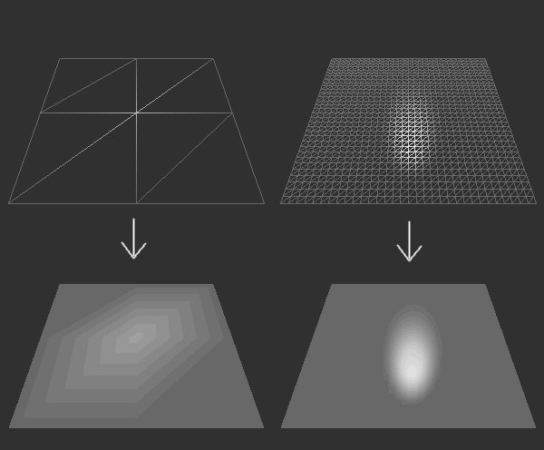 Eine quadratische Fläche wird in der Mitte mit einem Spotlight angestrahlt. Im linken Beispiel besteht diese Fläche nur aus 9 Vertices. Lediglich der mittlere Vertex wird vom Spotlight getroffen, die anderen 8 Vertices nicht. Obwohl der Radius des Spotlight wesentlich kleiner ist, als die quadratische Fläche, werden weite Teile der Fläche heller dargestellt, weil die Vertices soweit auseinanderliegen. (Farbabstufungen gibt es dabei aber nicht! Das liegt am Gif-Format!)