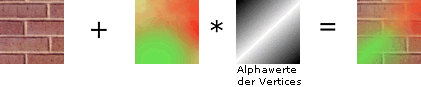 Der Nachteil dieses Verfahrens ist allerdings, dass die zweite Textur überall zu gleichen Teilen auf die erste Textur geblendet wird. Mit dem folgenden Code benutzen Sie die Alphawerte der Vertices, um die Texturen zu überblenden.
