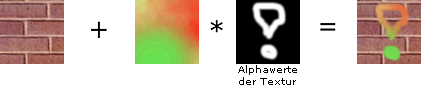 Je heller der Texel einer Lightmap ist, desto stärker erscheint der Texel der anzuzeigenden Textur in seinen Farben. Ist der Texel der Lightmap dunkler, wird auch der Texel der sichtbaren Textur dunkler dargestellt. Wenn tex1 ein Textur-Interface mit der anzuzeigenden Textur ist, und tex2 das Interface mit der Lightmap, dann könnte der Code für diesen Effekt so aussehen: