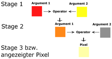 Die Farbargumente werden miteinander verrechnet, indem auf die Farbwerte jedes Texels beider Argumente die entsprechende Operation ausgeführt wird. Wenn also im zweiten Stage eines der Texel die RGB-Werte (1.0, 0.5, 0.0) hat, was Orange entspricht, und im zweite Argument die RGB-Werte (0.4, 0.4, 0.4), dann erhalten wir durch den Operator Addition als Rückgabewerte (1.0, 0.9, 0.4), diesen hellen Gelbton, wie er im Diagramm zu sehen ist. Theoretische Werte über 255 werden auf diese Obergrenze wieder herabgesetzt.