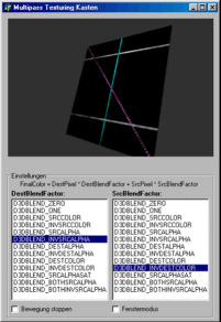 Multipass ist damit also das typische Werkzeug um zum Beispiel transparente Effekte von Glas, Feuer oder Rauch darzustellen. Doch mit dieser Technik können Sie noch viel mehr anfangen. Um die Vielfalt der Möglichkeiten besser begreifen zu können, liegt dieser Dokumentation im Verzeichnis /directxgraphics/demo/ des SelfDXD-Verzeichnisses ein Kastenprogramm bei, den Multipass Texturing Kasten (Achtung: nur in der Offline-Version).