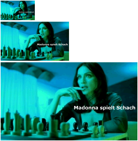Hier sehen Sie so eine Mipmap, bestehend aus 3 Miplevel. Das erste Bild würde man verwenden, wenn man wirklich weit von dem Objekt entfernt ist. Man erkennt grademal eine Frau, die mit dem Zeigefinger ihre Lippe berührt. Der weisse Text ist aber überhaupt nicht lesbar. Im zweiten Bild kann man schon den Text lesen und erkennen, dass diese Frau an einem Schachbrett sitzt. Das letzte Bild würde angezeigt werden, wenn wir uns sehr nah am 3D-Objekt befinden. Der Text ist klar erkennbar und hebt sich durch seine scharfen Kanten gut vom Hintergrund ab.