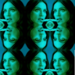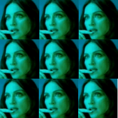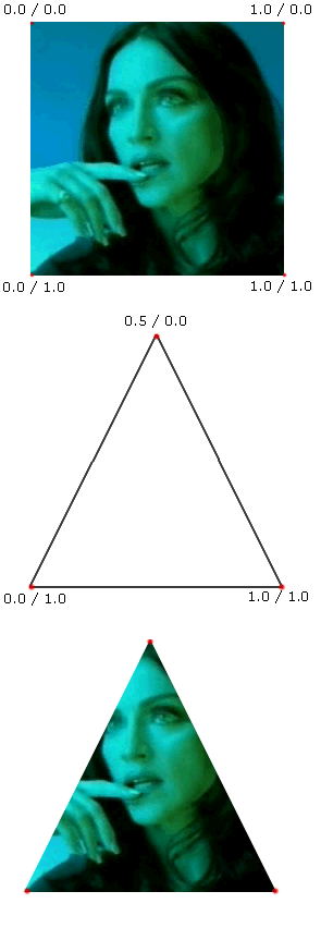 Das erste Bild zeigt eine Textur (Popstar Madonna) und die Texturkoordinaten für die vier Ecken. Das zweite Bild zeigt drei Vertices, die ein Dreieck bilden. Jeder dieser Vertices besitzt dabei eine u- und v-Texturkoordinaten. Im dritten Bild wird die Textur auf die Primitive angewendet.