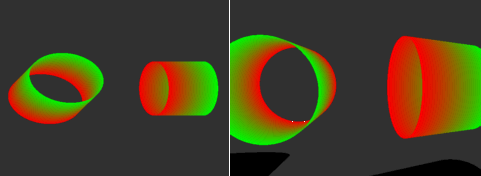 Das linke Bild enthält eine orthogonale Projektionsmatrix. Sie erkennen das zum Beispiel daran dass der Durchmesser des rechten Zylinders in die Tiefe hin nicht kleiner wird. Anders ist das im rechten Screenshot. Hier erhalten wir einen realistischen Eindruck räumlicher Tiefe.