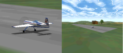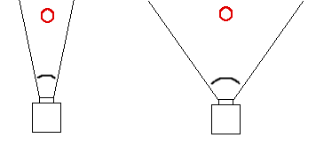 Zwei Kameras betrachten einen Zylinder aus der gleichen Entfernung, jedoch mit einem wesentlichen Unterschied. Die linke Kamera hat einen wesentlich kleineren Sichtwinkel, als die rechte. Demzufolge erscheint der Zylinder mit der linken Kamera näher, als mit der rechten, weil er grösser dargestellt wird, obwohl in beiden Fällen der Zylinder den gleichen Abstand zur Kamera hat. Das nachfolgende Bild macht dieses Phänomen an einem Flugzeug deutlich.
