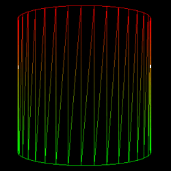 Der Aufbau des Zylinders wird recht deutlich an dem unteren Bild, bei dem man nur die Vorderseite des Zylinders sieht. Damit das Drahtgittermodell deutlicher wird, habe ich die Vertex-Zahl für diesen Screenshot ein wenig verringert.