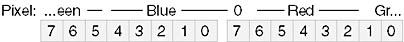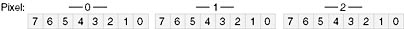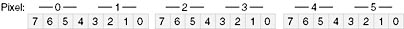 To see how the pixels are encoded, let's examine the four cases separately. In the diagrams shown below, the bits of each byte are shown in boxes and are numbered with 7 indicating the most-significant bit and 0 indicating the least-significant bit. Pixels are also numbered beginning with 0 for the leftmost pixel in the row.