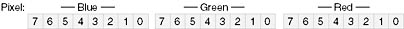 For DIBs with 24 bits-per-pixel, each pixel requires 3 bytes for the red, green, and blue color values. Each row of pixel bits is basically an array of RGBTRIPLE structures, possibly padded with 0 bytes at the end of each row so that the row has a multiple of 4 bytes: