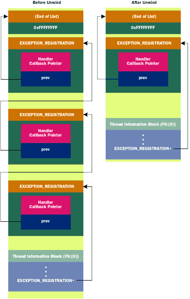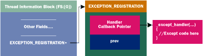 Remember the EXCEPTION_REGISTRATION structure that the system uses to find the exception callback function? The first member of this structure, which I ignored earlier, is called prev. It's really a pointer to another EXCEPTION_REGISTRATION structure. This second EXCEPTION_REGISTRATION structure can have a completely different handler function. What's more, its prev field can point to a third EXCEPTION_REGISTRATION structure, and so on. Simply put, there's a linked list of EXCEPTION_REGISTRATION structures. The head of the list is always pointed to by the first DWORD in the thread information block (FS:[0] on Intel-based machines).