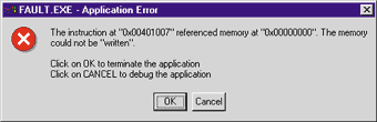 With the preliminaries out of the way, UnhandledExceptionFilter can get down to its primary job: informing you of your ignominious programming blunder with the ever- stylish Application Error dialog. There are two ways that this dialog can be avoided. The first is if the process has called SetErrorMode and specified the SEM_NOGPFAULTERRORBOX flag. The other method is to have the Auto value under the AeDebug registry key set to 1. In this case, UnhandledExceptionFilter skips the Application Error dialog and automatically fires up whatever debugger is specified in the Debugger value of the AeDebug key. If you're familiar with "just in time debugging," this is where the operating system supports it. More on this later.