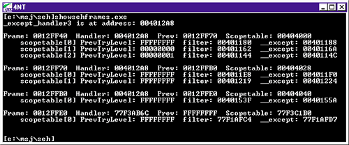 Figure 11 shows the results of running ShowSEHFrames. First, examine every line that begins with "Frame:". Notice how each successive instance shows an exception frame that's at a higher address on the stack. Next, on the first three Frame: lines, notice that the Handler value is the same (004012A8). Looking at the beginning of the output, you'll see that this 004012A8 is none other than the address of the __except_handler3 function in the Visual C++ runtime library. This proves my earlier assertion that a single entry point handles all exceptions.