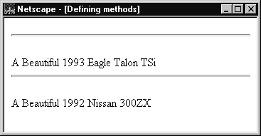 Methoden können für einen Objekttyp definiert werden, indem sie innerhalb einer Konstruktorfunktion definiert werden. Zum Beispiel knnte man eine Funktion definieren, welche die Eigenschaften des zuvor definierten car-Objekts formatiert und auflistet: