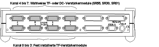 Die Kanäle 0 bis 3 sind mit Trägerfrequenz-Modulen fest belegt. Die Kanäle 0 und 1 (nicht bei Spider8-30) bieten zusätzlich die Möglichkeit, Frequenzen zu messen.
