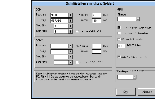 Wenn Sie Schnittstelleneinrichtung gewählt haben, erscheint auf Ihrem Bildschirm folgender Einstelldialog. Hier können Sie alle Parameter der betreffenden Schnittstelle einstellen.