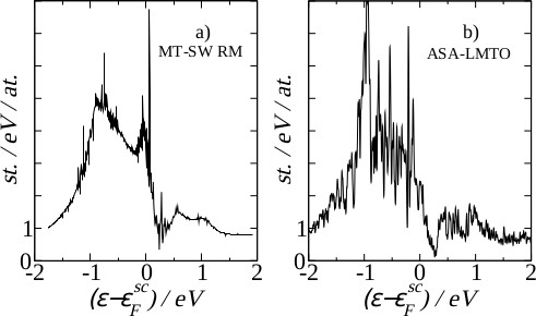 (128 bzw 138 Atome) liefert die Streuphasen der Atome. In einem Superblock aus Elementarzellen (etwa 10000 Atome) werden alle Atome außer das jeweilige Übergangsmetall gestrichem, nur etwa 1000 Atome bleiben. Mit Hilfe einer zweiseitigen Rekursionsmethode (RM) im Rahmen des MTSW-Konzepts wird für ein Atom im Zentrum der Teil der lokalen Zustandsdichte ermittelt, der in einer Rechnung am vollständigen Superblock durch Streuwege entstehen würde, die ausschließlich Übergangsatome enbeziehen. Im Fall des AlCuFe-(1/1)-Approximanten (Cockayne Modell) gleicht das Ergebnis bis auf eine Verschiebung enlang der Energieachse (im Bild nicht gezeigt) dem Ergebnis der ASA-LMTO Rechnung. |