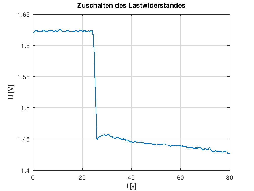 Dabei ist jedoch zu beachten, dass vor dem Einschalten der Strom und die Leistung natürlich Null sind. Der Einschaltzeitpunkt lässt sich aber leicht aus dem Sprung der Leerlaufspannung von ca. 1.62 Volt auf die Spannung unter Last von ca. 1.45 Volt bestimmen.