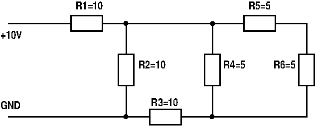 Variieren Sie nun einen der Widerstände im Bereich von 0 bis 100 Ohm und stellen Sie in einem Plot die 6 Spannungen über den Widerständen R1 .. R6 gegen den variierten Widerstandswert dar. Denken Sie auch an Legenden, Achsenbeschriftungen etc.